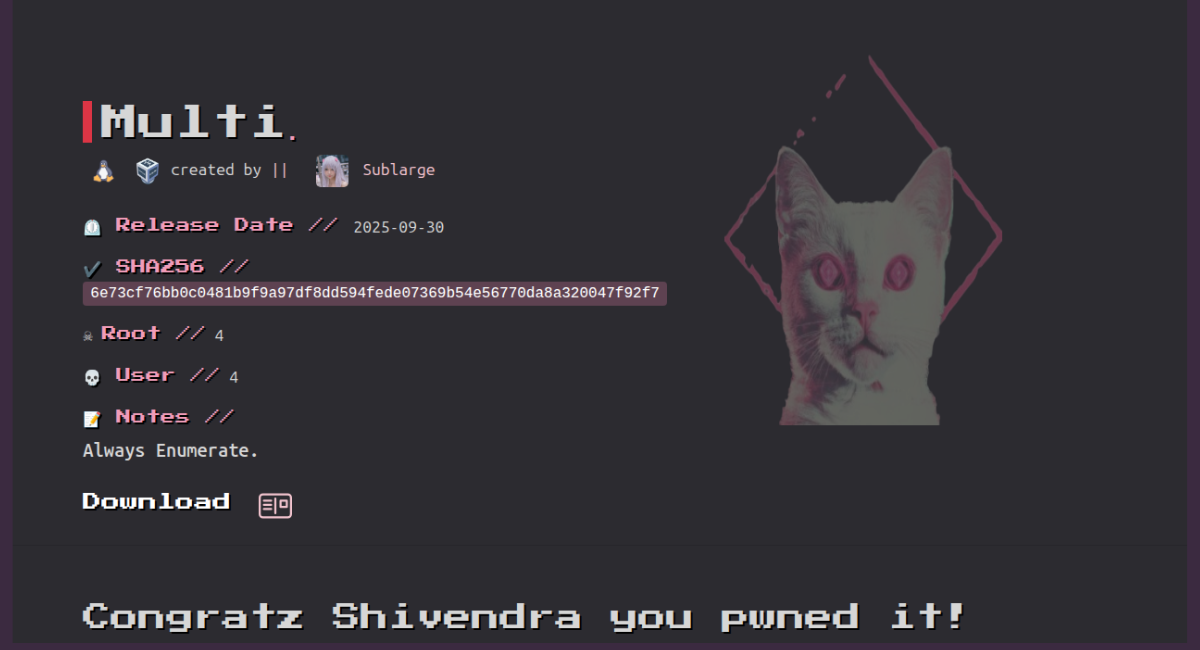 Multi is a hard-level Linux machine on HackMyVM that emphasizes multi-layered exploitation, starting with service enumeration across FTP, SSH, NFS, Samba, and web services, leading to SQL injection and privilege escalation through sudo misconfigurations. It involves concepts like IP spoofing, SQLi for RCE, backdoor activation, and network hijacking for sudoers manipulation. My learning goals were to practice SQLi automation with sqlmap, network spoofing with bettercap, and creative sudo abuse, while reinforcing ethical pentesting practices.